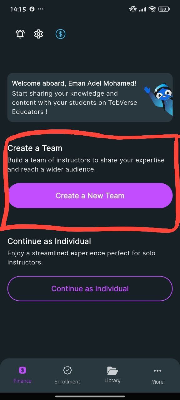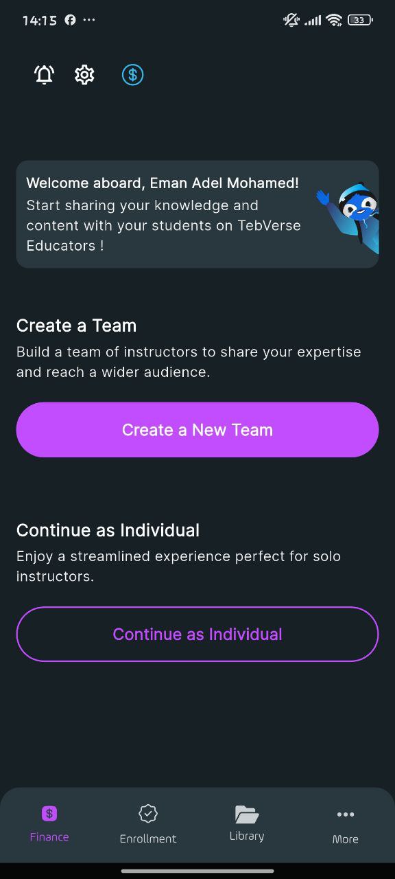 بعد ما تخلص خطوات التسجيل (إدخال البيانات → كلمة السر → الاسم → التخصص → Overview)، هيظهرلك شاشة البداية دي