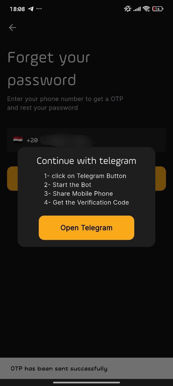 هيوصلك كود على تليجرام دخّله في التطبيق واضغط "تأكيد".اكتب كلمة سر جديدة، وأكدها مرة ثانية، واضغط "حفظ".