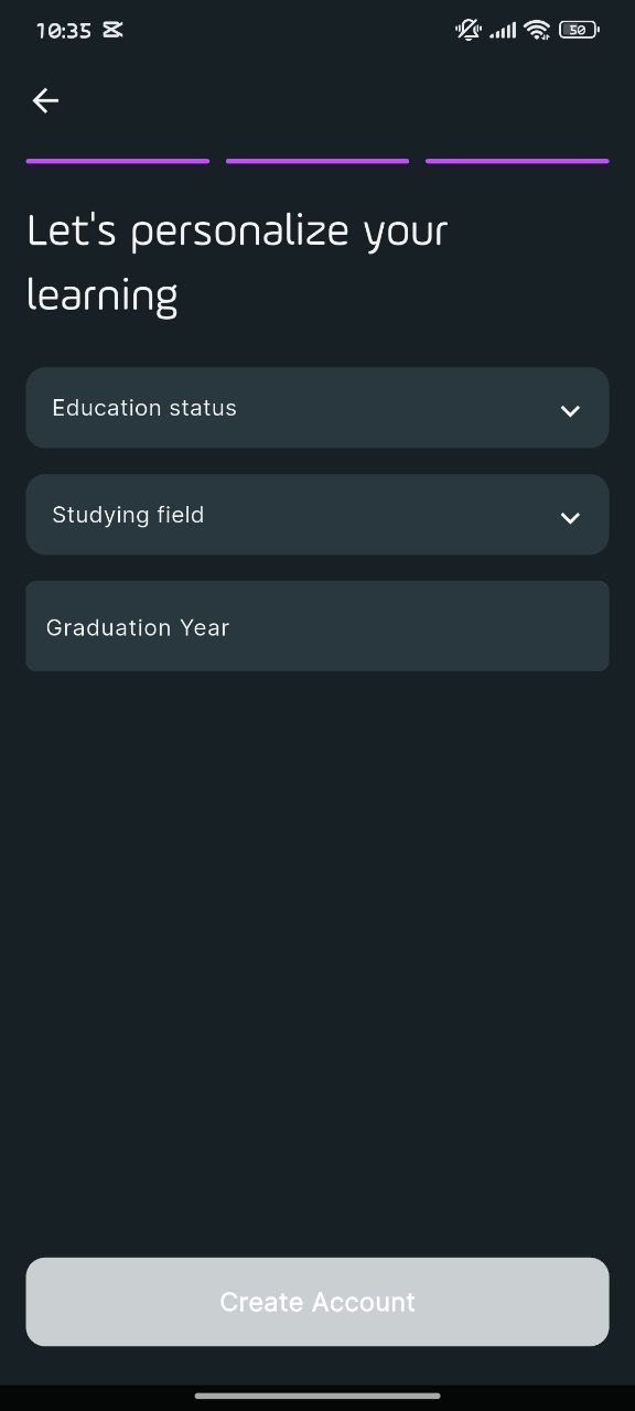 - اختر بياناتك التعليمية (Education status, Studying field, Graduation year).